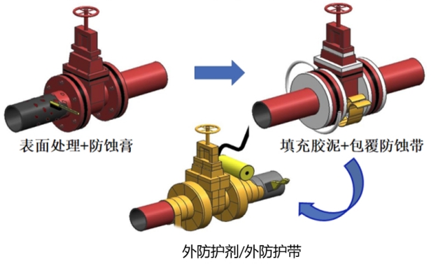 (6)针对法兰、阀门、螺栓、螺母等异形件的腐蚀难题,推荐使用包覆防腐技术。包覆防腐技术采用防蚀膏+防蚀带+外防护带三层结构,适用于各类异形、复杂结构的防腐修复,该项技术可带锈施工,无需机械除锈,在将表面浮锈、杂物清理干净后即可进行包覆防腐,施工过程中无需关闭气源阀门,且该项技术无需固化时间,可一次性连贯性施工,大大节省施工时间;包覆防腐材料中含有性能优良的防锈成分,能够强有力的粘附在钢铁表面,起到优良、长效保护作用,从而达到与设备、装备同寿命的防腐效果。