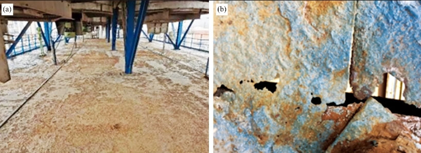 (3) 在钢结构平台使用期间,花纹板普遍存在因积液、污垢清理不及时而导致防腐蚀涂层的失效问题,且涂层大面积损坏后未能进行及时修复。