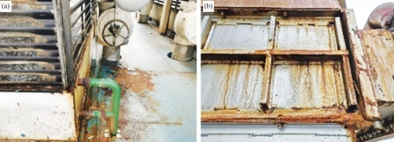 (6)湿式空冷器及周围设施的腐蚀情况可以看出,炼化企业采用湿式空冷器,外腐蚀普遍较为严重,除设备本体发生腐蚀外,飞溅的喷淋水导致平台及周围设备、管道和钢结构也发生了严重腐蚀。