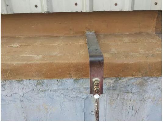 (3)罐体直径较大,周长长,保护面积大,单纯采用螺栓紧固缺少牢固的受力点,夹克外护层容易松弛脱落。在安装前必须对这3个问题采取相应的措施进行处理。接地点现场照片图所示。