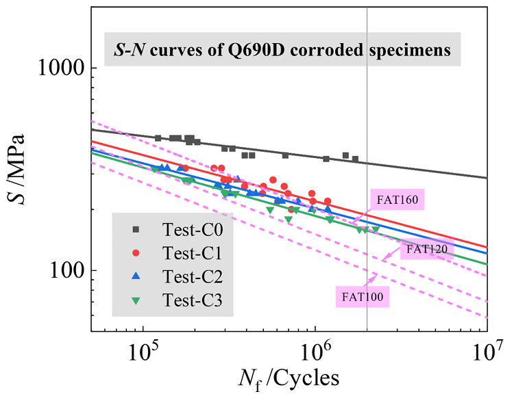 研究表明,随着腐蚀程度的增加,Q690D高强钢在单轴拉伸下弹性模量、屈服强度和极限应力都会下降,且疲劳性能也会变差。在高周疲劳情况下,腐蚀后Q690D高强钢的S-N曲线的斜率会变得更加陡峭;S-N曲线的拟合结果显示,腐蚀程度对长寿命区疲劳寿命影响较大,且腐蚀后S-N曲线的斜率更加均匀。整体腐蚀的钢梁的疲劳寿命随着荷载频率的增加而减少,并随着应力比的增加而减少。此外,局部腐蚀对钢梁弯曲刚度的影响比起整体腐蚀更大,且对钢梁下半区的影响大于右半区的影响。