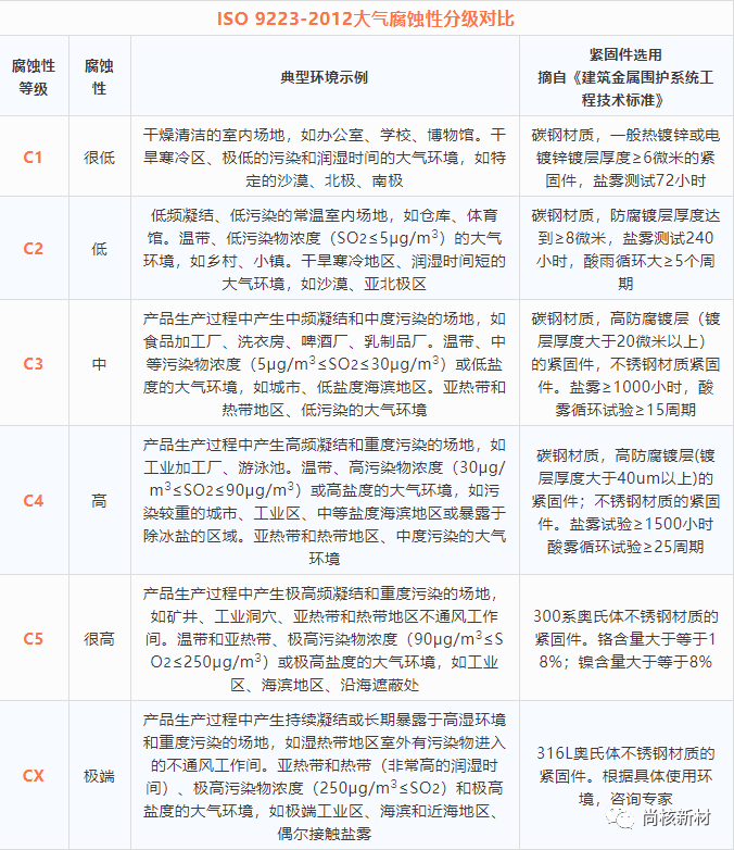 因此,ISO 9223-2012将大气腐蚀性分类为6类,在前5类的基础上增加了一级CX——应用于特定海洋和海洋/工业环境,具体的大气腐蚀性等级对照表如下: