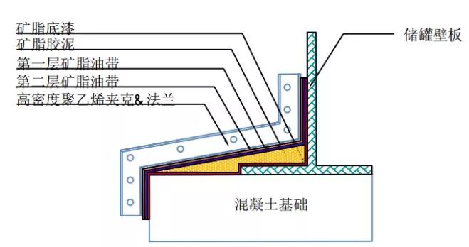 矿脂底漆层主要是采用底漆均匀涂敷在储罐壁板、储罐边缘板、水泥基座上表面、水泥基座侧面上,用来改善混凝土基台和储罐钢板的表面质量。中间填充层是在罐壁凹角处自里向外用矿脂胶泥填充过渡,在混凝土基台上形成斜坡,引导雨水流出。油带层是用两层矿脂油带紧密贴覆在矿脂油和矿脂胶泥施工区域,形成致密的油性防腐层。夹克外护紧密覆盖在矿脂带上面,为防腐层提供可靠的机械保护。