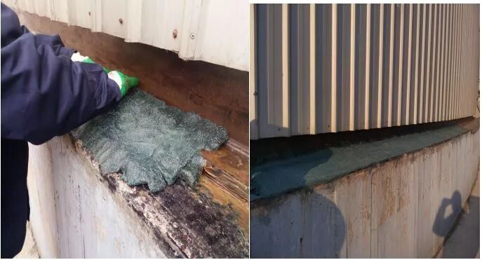采用矿脂胶泥对储罐边缘板和水泥基座之间的缝隙进行填充,自罐壁凹角处自里向外用矿脂带填充过渡,应保证表面平整、光滑,自里向外应形成一定的坡度(大于8°),以避免产生存水区域。填充过程和效果见下图。