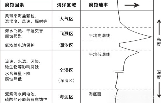 全浸区(水下区):浅水区(<30米)因生物活跃、水温高成为腐蚀热点;随水深增加,腐蚀程度减轻。