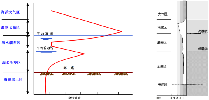 海洋钢结构设施在不同环境下的腐蚀速度图(左)与腐蚀深度图(右)